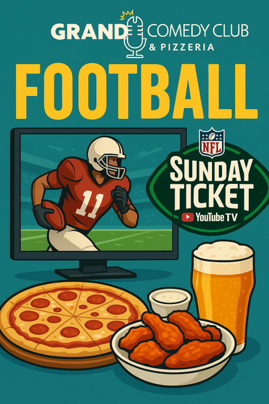 Grab a seat at Grand Comedy Club & Pizzeria, where you can enjoy every NFL matchup with NFL Sunday Ticket, ice-cold beer, delicious pizza, and wings in a fun, welcoming sports-bar atmosphere.
